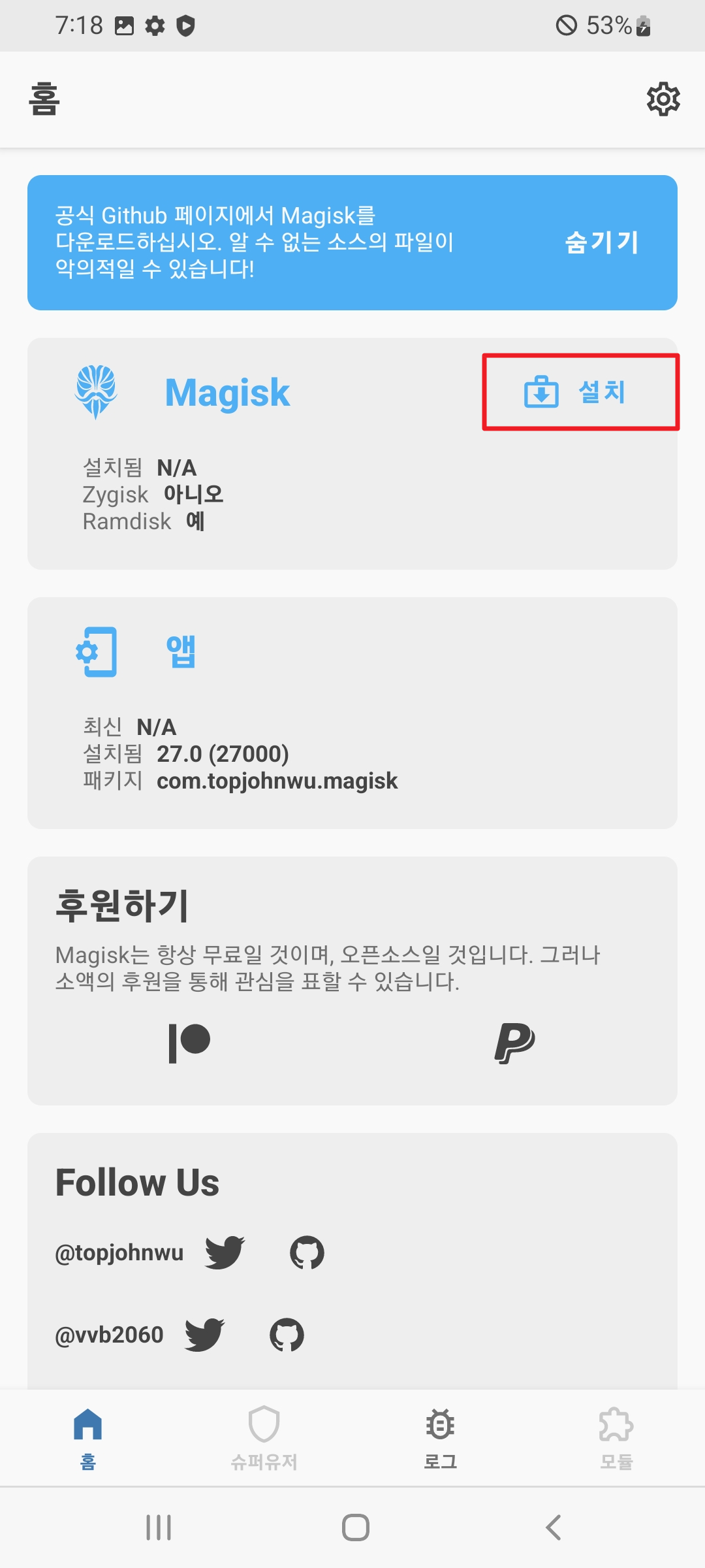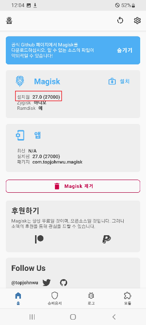 설치됨 항목에 버전이 표시되면 루팅 완료